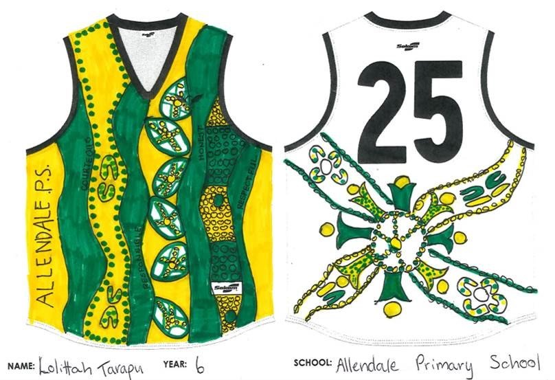 The Allendale Primary School jumper was the creation of Lolittah Tarapu (Year Six), whose design was based around using Aboriginal artwork to reflect a meeting place for boys and girls to play football. She also had a strong focus on using the colours of her Geraldton-based school.