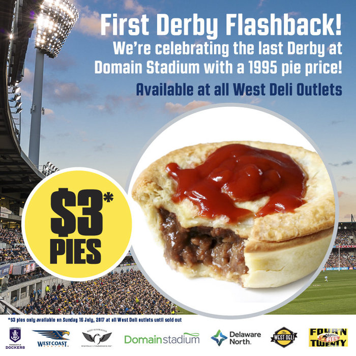 To celebrate the final Derby, Domain Stadium will be offering a ‘First Derby Pie Price’ of $3 at all West Deli outlets until supplies sell out.