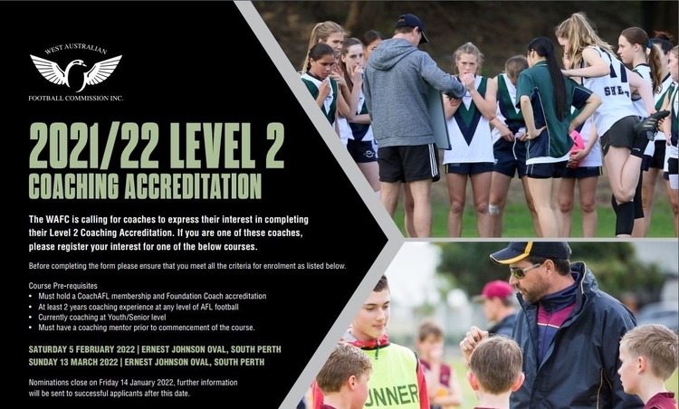 The WA Football Commission are seeking expressions of interests for upcoming level 2 coaching courses. This is a great opportunity for Youth and Senior coaches who meet the below pre-requisites to further their coaching development and achieve Level 2 Accreditation in 2021/22.