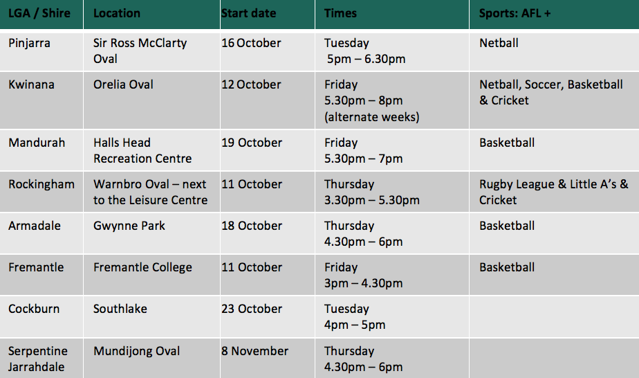 The after school footy program was developed by the WAFC and is run in partnership with WA Police, various Local Governments, and Shires as well as a broad range of local service providers and state sporting associations.
