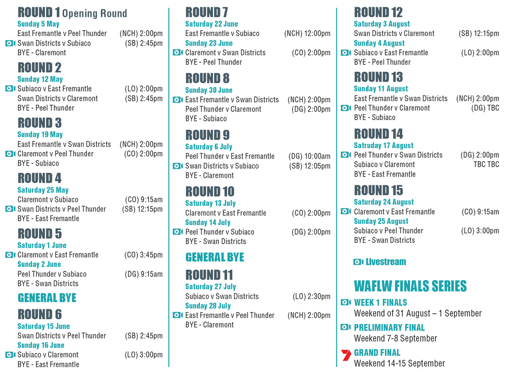 A game will also be livestreamed during each week of the WAFLW finals and the WAFLW Grand Final will be televised live on the 7 Network.