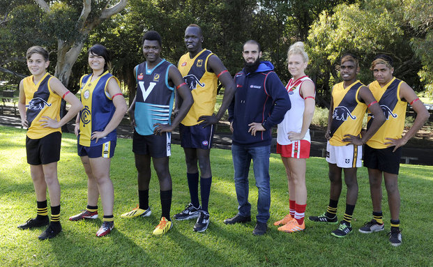 Photo: AFL Multicultural Ambassador Bachar Houli with players who will wear red arm bands this weekend.