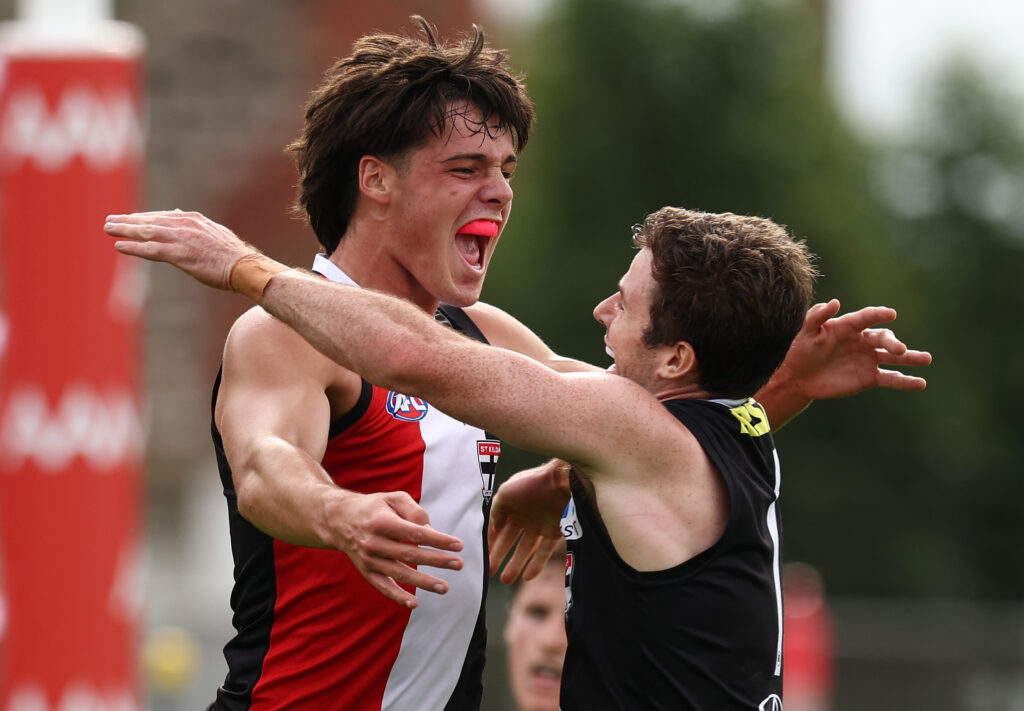 Charlie Banfield celebrates a goal with Jack Higgins during St Kilda’s 2026 AFL AAMI Community Series win over Essendon in Ballarat. Picture: James Wiltshire/AFL Photos