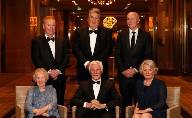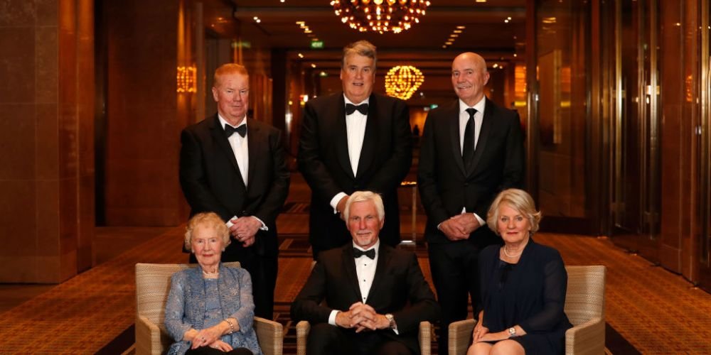 Hall of Fame Inductees Back Row (L-R) Brad Hardie, Michael Deane (son of Jim), Ken Hunter – Front Row (L-R) Norma Barker (Mother of Trevor), Mick Malthouse, Andrea Evans (wife of Ron) pose for a photograph during the 2019 Australian Football Hall of Fame Dinner at Crown Palladium on June 04, 2019 in Melbourne, Australia. Photo: Getty