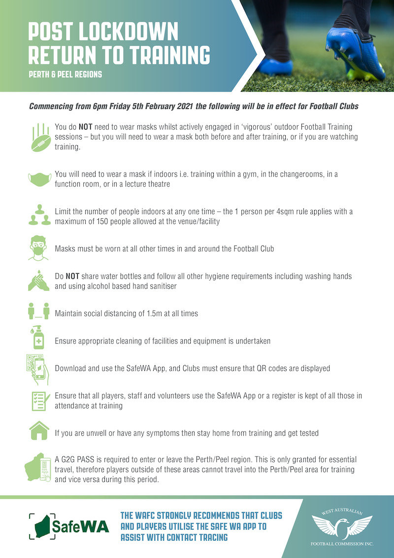 Following the WA State Government announcement in respect to easing of the lockdown requirements as of 6pm tonight (Friday 5th February 2021) the following protocols must be adhered to by all football clubs within the Perth & Peel Regions.