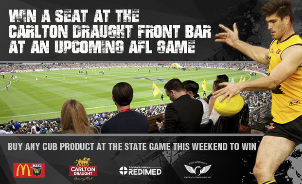 Purchase a Carlton and United Breweries (CUB) beverage at the WAFL State Game at Steel Blue Oval on Saturday and go into the draw to win tickets to the Carlton Draught Front Bar (strictly 18+) at Domain Stadium during the Fremantle Dockers v Port Adelaide Round 13 clash on Saturday, June 18 or when the West Coast Eagles take on North Melbourne in Round 16 on Sunday, July 10.